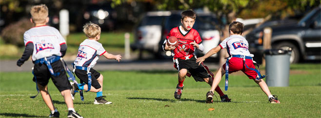 Flag football is played on a smaller field with fewer players per team (5 vs. 5), and is a no contact sport. Flag is a great entry point to the fun and challenging sport of football.